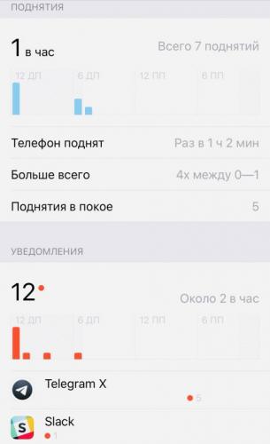 Отметим, что iPhone даже считает количество поднятий и активаций экрана в день. А также общее количество уведомлений по всем программам.