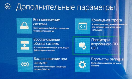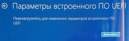 И вот мы там, где нужно — нажмите по пункту «Параметры встроенного ПО UEFI», затем подтвердите перезагрузку для изменения настроек БИОС и после перезагрузки вы увидите интерфейс BIOS UEFI вашего компьютера, не нажимая никаких дополнительных клавиш.
