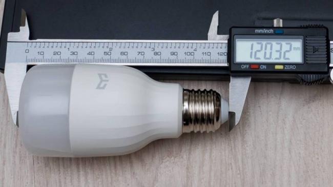 Лампочка довольно массивная, цоколь — самый распространенный Е27. Большая часть лампочки — скрывается за белым непрозрачным пластиком с логотипом Yeelight, примерно треть лампочки — за полупрозрачной крышкой, за которой находятся светодиоды.