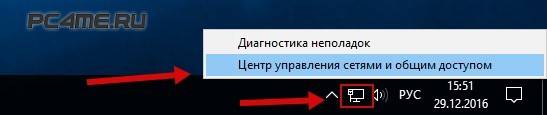 - Для начала, надо кликнуть правой клавишей мыши по значку сети, расположенной в области уведомлений системы. После этого надо будет перейти в «Центр управления сетями».
