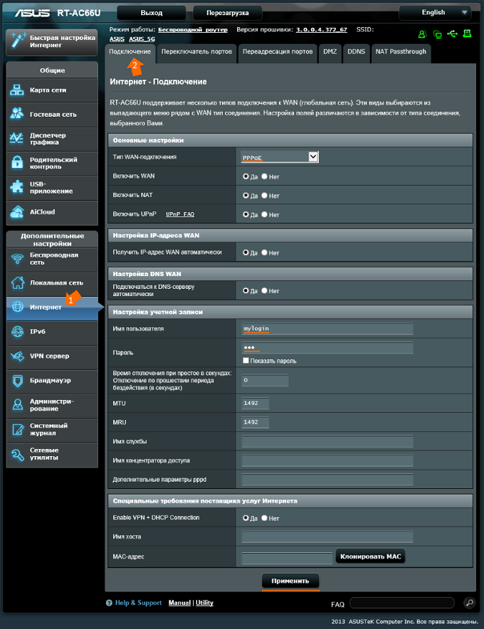 В этой же вкладке имеется инструмент «Подключение к Интернет». Здесь по умолчанию выбран интерфейс PPPoE1, поэтому вам останется только ввести имя пользователя и пароль, что предоставляется поставщиком услуг, после этого вы сможете выйти в интернет при подключении через LAN-кабель.