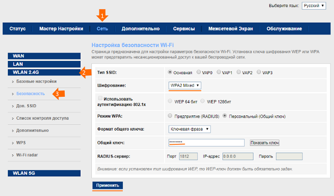 - В разделе «Безопасность» отметьте точкой тип SSID, для которой совершается создание правил, обычно это «Основная». Режим шифрования рекомендуется установить «WPA2 Mixed», он является самым надежным. Измените общий ключ на более сложный. Только после его введения при соединении с точкой аутентификация произойдет успешно.