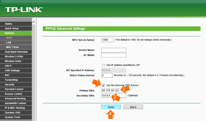 Скорость открытия страницы по доменному имени зависит от географического расположения DNS-сервера, поэтому основным DNS-сервером рекомендуем указать региональный DNS-сервер Ростелекома. В качестве альтернативного DNS-сервера укажите открытый надежный DNS-сервер Google. К нему будет обращаться маршрутизатор, если возникнут проблемы с доступом к ближайшему DNS-серверу.