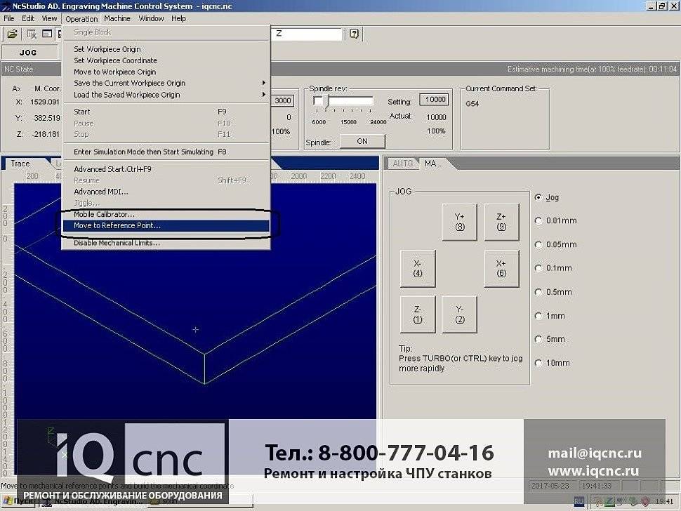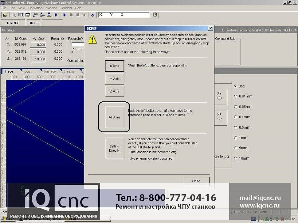 Для продолжения работы с оборудованием следует «увести» станок в нулевую точку или иначе говоря в его «дом».