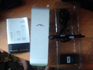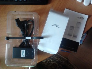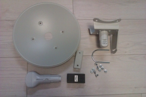 Прошел быстро и легко — я не раз слышал про недорогие и хорошо себя зарекомендовавшие мосты от Ubiquiti. Выбор NanoBridge M5 был обусловлен частотным диапазоном (работает в менее зашумленном 5 GHz), интегрированной с передатчиком антенной (моя модель с 300мм 22 dBi), готовым к бою комплектом (передатчик+антенна+PoE адаптер), поддержкой MIMO 2х2. Полторы недели томительного ожидания посылки были скрашены чтением профильных форумов и how-to-шек по настройке, так же в изобилии обнаруживаются отчеты о запуске длинных линков на 10-20-30 км. В мои задачи такие расстояния не входили — всего-то 300 м поверх трёх многоэтажек, гораздо критичнее итоговая полезная полоса. И вот свершилось — курьер приносит вожделенную коробку. Вскрываем, изучаем комплектацию: