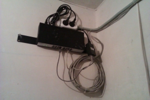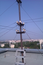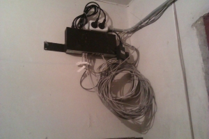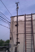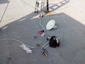 Ламинат завален Включаем, перешиваемся, забиваем минимально-необходимые настройки, тестируем работу в связке. Ничего непредвиденного — оно просто работает. Наигравшись с точками на стенде приступаем к самой «увлекательной» процедуре — получением ключей от крыши. Пройдя этот невероятно муторный квест (с читами) начинаем подыскивать удобное местечко для установки оборудования.Критерии: 1) ничего не сверлить 2) минимум расстояния для прокладки кабеля 3) установленное оборудование никому не должно мешать В качестве точки закрепления была выбрана вершина опоры радиофикации. В идеале хотелось свои кронштейны, но пункт «1» был строго обязателен.ВНИМАНИЕ ! Старайтесь избегать использования чужих опор, тем более с проводами под напряжением! Все работы проводите крайне внимательно!Монтаж