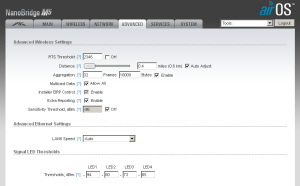 Так же стоит отключить кнопку сброса к заводским настройкам — в сети имеются отзывы о неприятностях при попадании влаги на ее контакты. Снимаем флаг System > Miscellaneous > Reset button Комментарии по параметрам: WDS — режим прозрачного моста Country Code — выбираем «Compilance test» для снятия ограничений по ширине канала Frequency Scan List — задаем фиксированную частоту работы, ОЧЕНЬ сильно ускоряет соединение точек Aggregation — повышает утилизацию канала, подбирается эмпирическиВНИМАНИЕ ! Будьте аккуратны меняя параметры Wi-Fi соединения! Используйте режим предварительного тестирования — этим вы убережете себя от прогулки к удаленной стороне моста. Точка доступа имеет встроенный тестер скорости соединения, перейдем в Tools > Speed Test и посмотрим что получилось: