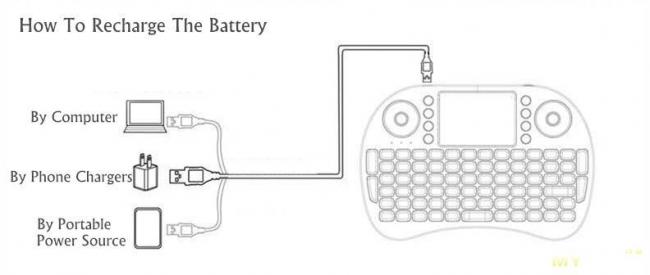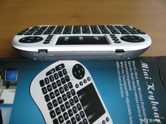 На торцевой части — кнопка включения/выключения и Micro-USB для зарядки. Управление через шнур не происходит. В левом верхнем углу расположились клавиши управления плеером, под ними 3 диода. — Первый диод говорит о том, что клавиатура включена и горит синим цветом. — Второй диод — зарядка батареи, горит красным, когда батарея заряжается. — Третий диод загорается оранжевым светом каждый раз при нажатии кнопок. Если не нажимать кнопки, клавиатура переходит в «спящий» режим через 13 секунд. «Пробуждается» — нажатием любой кнопки или тычком по тачпаду.